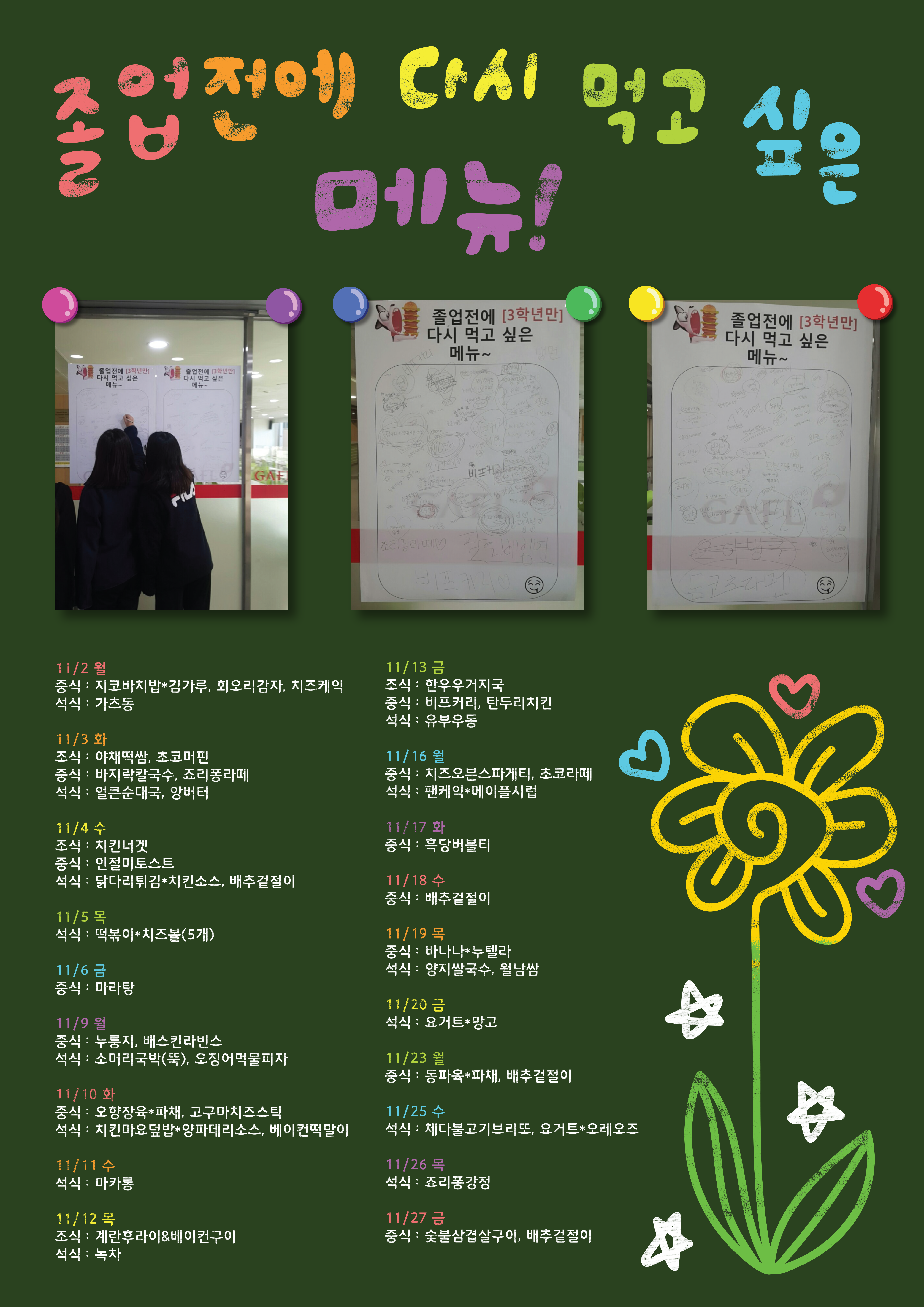 3ÇгâÀ» ´ë»óÀ¸·Î Á¶»çÇÑ "Á¹¾÷Àü¿¡ ´Ù½Ã ¸Ô°í ½ÍÀº ¸Þ´º"¿¡ ´ëÇÑ °á°ú¸¦ 11¿ù 2ÀÏ(¿ù) ºÎÅÍ Á¦°øÇϰíÀÚ ÇÕ´Ï´Ù.