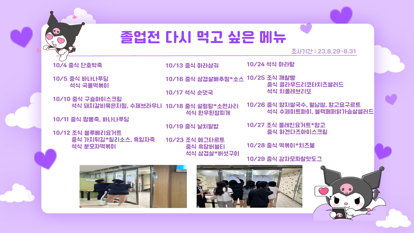3Çгâ ÇлýµéÀ» ´ë»óÀ¸·Î Á¶»çÇÑ £¢Á¹¾÷Àü ´Ù½Ã ¸Ô°í ½ÍÀº ±Þ½Ä ¸Þ´º£¢¿¡ ´ëÇÑ °á°ú¸¦ 10¿ù ½Ä´Ü¿¡ ¹Ý¿µÇÏ¿© Á¦°øÇϰíÀÚ ÇÕ´Ï´Ù.