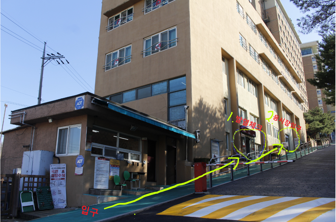 - ÀÔ±¸¿¡¼ ¹Ù·Î º¸ÀÌ´Â °Ç¹°ÀÌ ½ÃÇè ÀÀ½Ã °Ç¹°À̸ç, °Ç¹° ù¹øÂ° ÀÔ±¸ (»çÁø1_°øÀÚÇдç)·Î µé¾î¿À¼Å¼ ¹ß¿ üũ¸¦ ÇϽŠÈÄ, ´Ù½Ã °Ç¹° ¹ÛÀ¸·Î ³ª¿Í 1¹ÌÅÍ Á¤µµ ¿Ã¶ó¿À½Ã¸é ¹Ù·Î °°Àº °Ç¹° µÎ¹øÂ° ÀÔ±¸°¡ ÀÖ½À´Ï´Ù (»çÁø 2_ÈÇнÇ) ±× ÀÔ±¸·Î µé¾î¿À½Ã¸é ´ë±â Àå¼Ò°¡ ¸¶·ÃµÇ¾î ÀÖ½À´Ï´Ù.