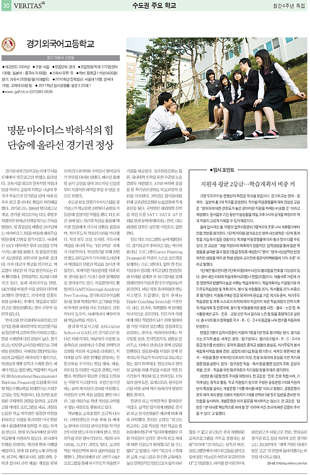 °æ±â¿Ü±¹¾î°íµîÇб³´Â ÀÌÁ¦ ¹«¼¿î ½Å¿¹¿¡¼ ¸í¹®¿Ü°íÀÇ ¹Ý¿·Î ¿Ã¶ó¼¹´Ù. ±³À°±â¾÷ ´ë±³ÀÇ ÀüÆøÀûÀÎ Áö¿ø°ú ¸íÀå ¹ÚÇÏ½Ä ±³ÀåÀÇ ÁöÈÖ·Î ³ª³¯ÀÌ ÁÖ°¡°¡ Ä¡¼ÚÀ¸¸ç °æ±â±ÇÀ» ³Ñ¾î ±¹³» ÃÖ¿ì¼ö ¿Ü°í Áß Çϳª·Î È®½ÇÈ÷ ÀÚ¸®¸Å±è Çß´Ù. °æ±â¿Ü°í´Â 2004³â ¸íÁö¿Ü°í·Î °³±³, °æ±â±Ç ¿Ü°í·Î¼´Â ´Ù¼Ò ÈĹßÁÖÀÚ¿´Áö¸¸ ¶Ù¾î³ ÁøÇнÇÀûÀ¸·Î ÁÖ¸ñÀ» ¹Þ¾Ò´Ù. ù Á¹¾÷»ýÀ» ¹èÃâÇÑ 2007³â¿¡´Â ¾ÆÀ̺ñ¸®±× 3¸íÀ» ºñ·ÔÇØ ÇØ¿ÜÁÖ¿ä ¸í¹®´ë¿¡ 23¸íÀ» ÇհݽÃÄ×°í, ±¹³»¿¡¼± SKY ´ëÇп¡¸¸ ¹«·Á 101¸íÀ» ÁøÇнÃŰ´Â Äè°Å¸¦ ¿Ã·È´Ù. ù Á¹¾÷»ý ÀοøÀÌ 321¸íÀÓÀ» °¨¾ÈÇÏ¸é ³î¶ó¿î °á°ú´Ù. ÀÌÈÄ ´ë±³°¡ Çб³¸¦ ÀμöÇϰí, ¹Ú±³ÀåÀÌ ÃëÀÓÇÑ µÚ Çб³ ¹ßÀü¼Óµµ´Â ´õ¿í »¡¶óÁ³´Ù. ÁøÇнÇÀûµµ ¼º°ú¸¦ ´õÇØ°¡°í ÀÖ´Ù. ¿ÃÇØ ÇØ¿Ü´ëÇÐÀº 55¸í, SKY´ë¸¦ ºñ·ÔÇÑ ¼¿ï »óÀ§±Ç ´ëÇп¡ 282¸íÀÌ ÁøÇÐÇß°í, ÀÇÇÐ°è¿ ÁøÃâµµ Á¡Á¡ ´Ã¾î³ª´Â Ãß¼¼´Ù. ¸í½Ç°øÈ÷ ¸í¹®¿Ü°í·Î ¹ßµ¸¿òÇß´Ù´Â ÆòÀÌ ÇãÅõ·ç µé¸®Áö ¾Ê´Â´Ù.