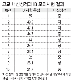 ³»½Å »óÀ§±Ç Çлý 7¸íÀÌ IB ½ÃÇè¿¡¼´Â ÃÖÇÏÀ§±Ç(ÇÏÀ§ 20%)¿¡ Æ÷ÇÔµÈ °Í. ¾Ï±â ÀßÇØ ³»½Å 1µî±ÞÀ» ¹Þ¾Æµµ IB °°Àº âÀÇ·Â ½ÃÇè¿¡¼´Â 7~9µî±ÞÀ» ¹ÞÀ» ¼öµµ ÀÖ´Ù´Â ¸»ÀÌ´Ù. ½ÇÇè¿¡ Âü¿©ÇÑ ÇÑ ÀϹݰí Ãâ½Å Çлý(18)Àº ½ÃÇè ÈÄ ÀÎÅͺ信¼ "´Ü¾î Çϳª ¾Ï±âÇÒ ½Ã°£¿¡ µ¶¼¸¦ Çϰí Àڱ⠻ý°¢À» ¹ß´Þ½ÃŰ´À¶ó ¼ºÀûÀÌ ³ª»Û Ä£±¸µéÀÌ ÁÖº¯¿¡ ÀÖ´Ù"¸ç "³ªº¸´Ù ±×·± ¾ÆÀ̵éÀÌ (À̹ø IB ½ÃÇè¿¡¼) ÁÁÀº Á¡¼ö¸¦ ¹Þ¾ÒÀ» °Í °°´Ù"°í ¸»Çß´Ù.